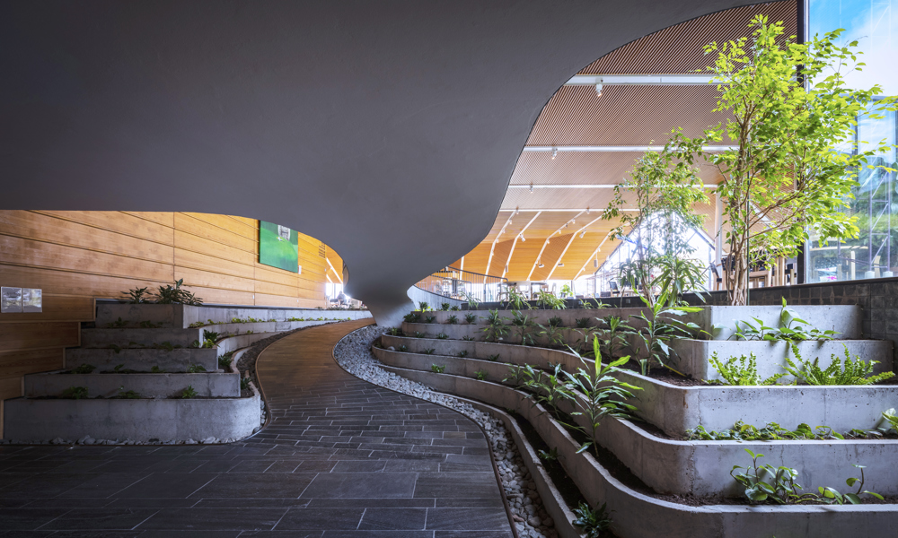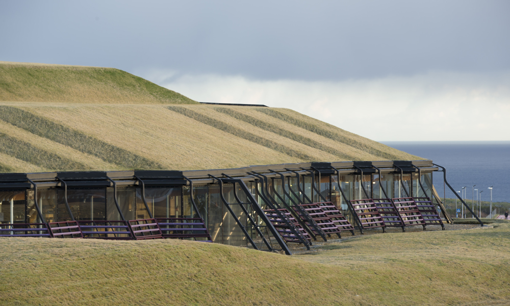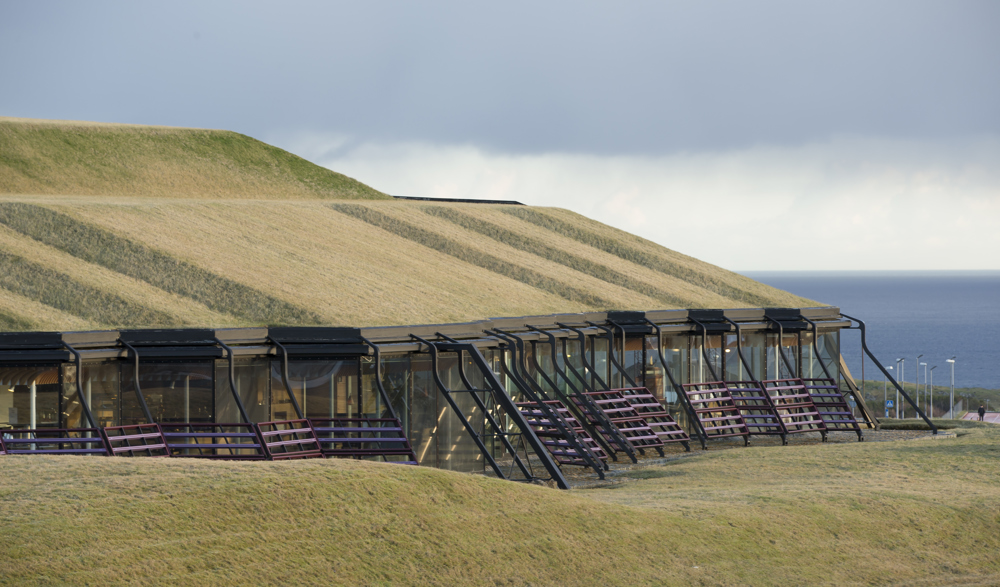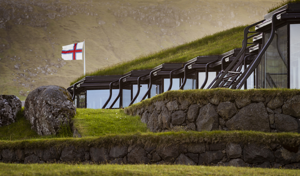 Når dørene åbner, træder du ind på et gulv af norsk granit, møblerne er finske, træpanelerne stammer fra de svenske skove, stål og glas er hentet i Danmark, og oven på taget, som er islandsk, gror det grønne færøske græs. Bygningen er en arkitektonisk perle og giver desuden udsigt over Tórshavn, havet og den nærmeste ø Nólsoy.